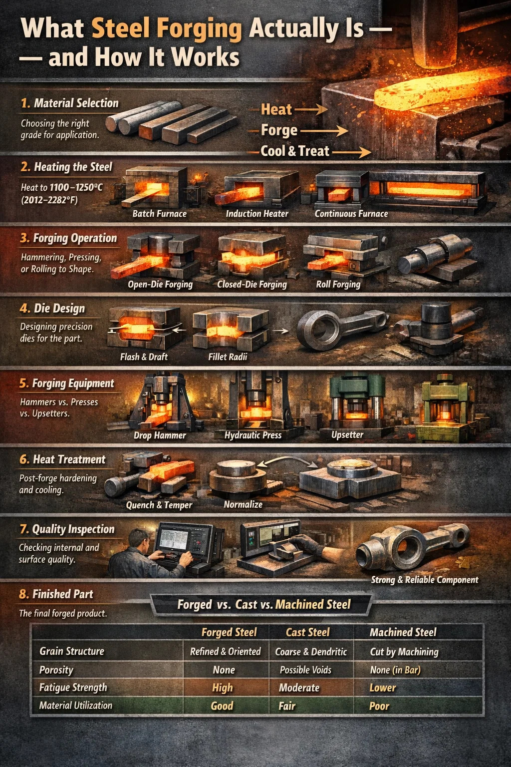 Steel forging is the process of shaping steel by applying compressive force — either through hammering, pressing, or rolling — while the metal is heated to a temperature between 1,100°C and 1,250°C (2,012°F to 2,282°F). At that range, steel becomes plastic enough to deform without cracking, yet it retains the grain structure that gives forged parts their superior mechanical strength. The result is a component that is structurally denser, tougher, and more fatigue-resistant than anything cast or machined from bar stock.