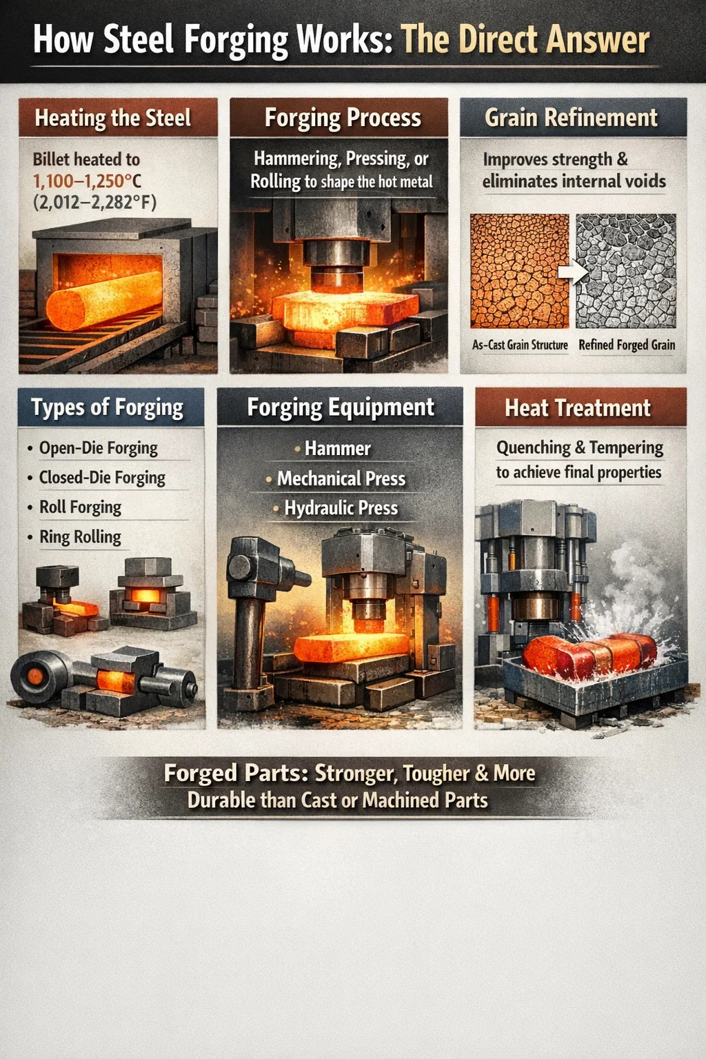 Gyakorlatilag az acéltuskót vagy tuskót a közé melegítik 1100 °C és 1250 °C (2012°F – 2282°F) melegkovácsoláshoz – ez a leggyakoribb ipari módszer –, majd prés vagy kalapács alá helyezzük, amely a kívánt alakra deformálja. Az formázott alkatrészt ezután ellenőrzött körülmények között lehűtik, és megmunkálással, hőkezeléssel vagy felületkezeléssel befejezik.