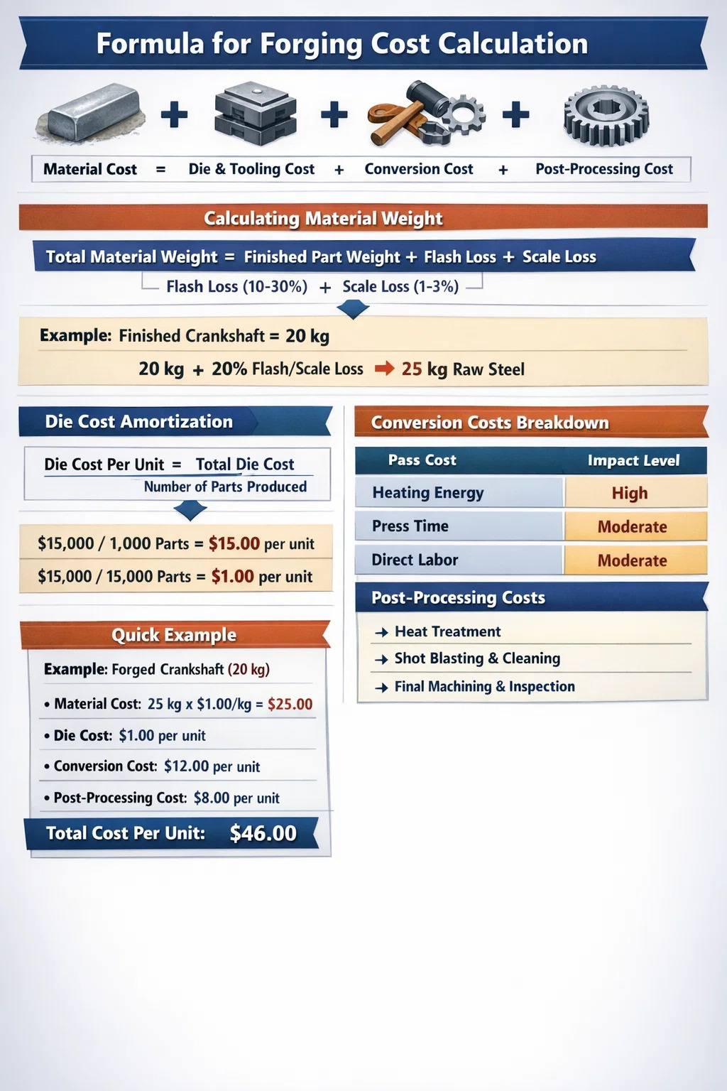 A teljes költség kiszámítása acél kovácsolás négy elsődleges pillér összegzését foglalja magában: Anyagköltség (nettó tömeg plusz flash veszteség), Szerszámozás/matrica költségek (a gyártási ciklus alatt amortizálva), Konverziós költség (energia-, munka- és géprezsi), ill Utófeldolgozási költségek (hőkezelés és megmunkálás). Egy szabványos közepes méretű hajtómű esetében az anyag általában a teljes egységár 40-50%-át teszi ki, míg a szerszámozás a legnagyobb előre változó.