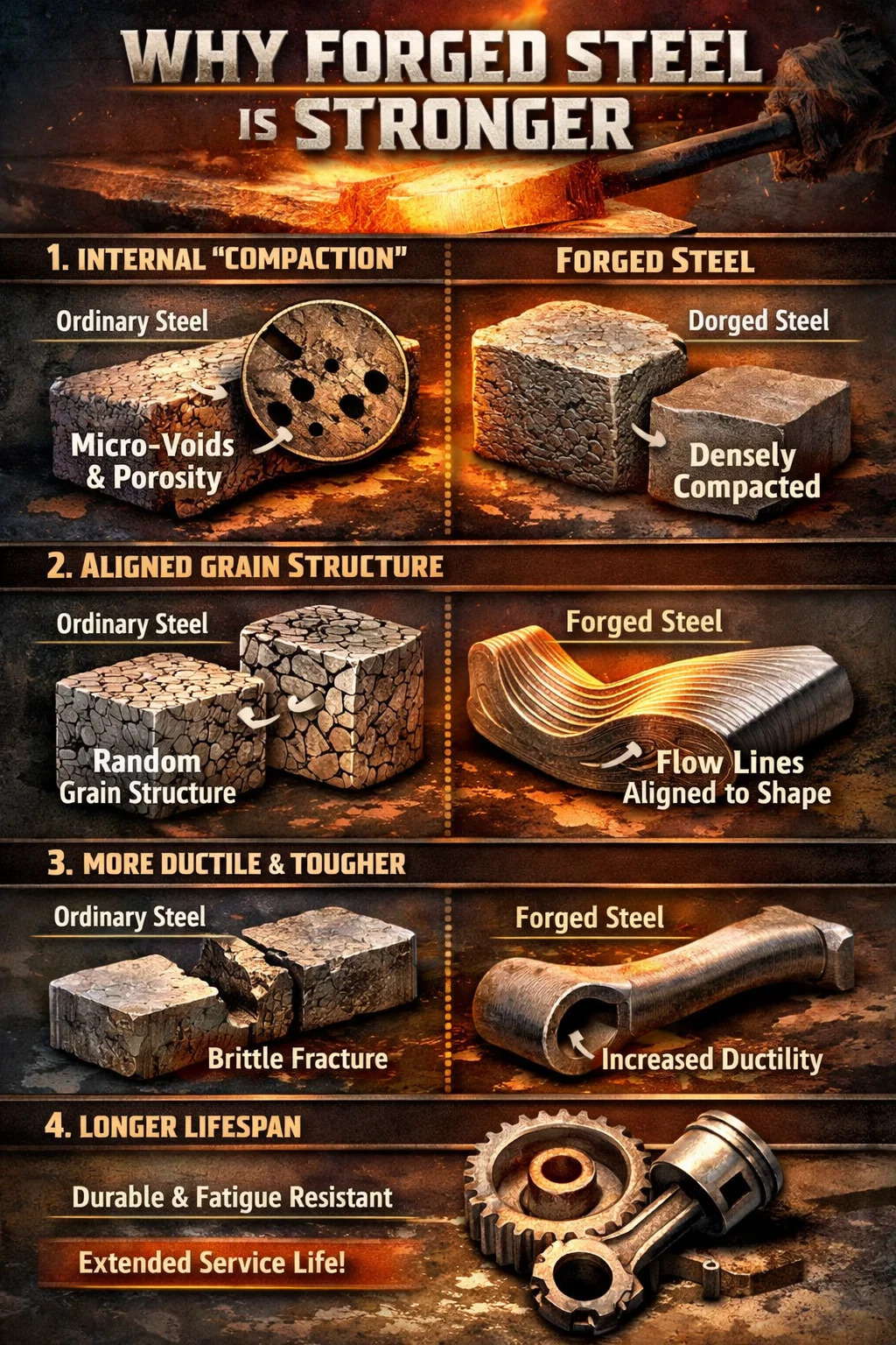 A kovácsolt acél valóban erősebb, mint a közönséges acél (mint például a feldolgozatlan nyersanyagok vagy az öntött acél). Ez az "erő" nemcsak keménységében, hanem tartósságában és megbízhatóságában is megmutatkozik.