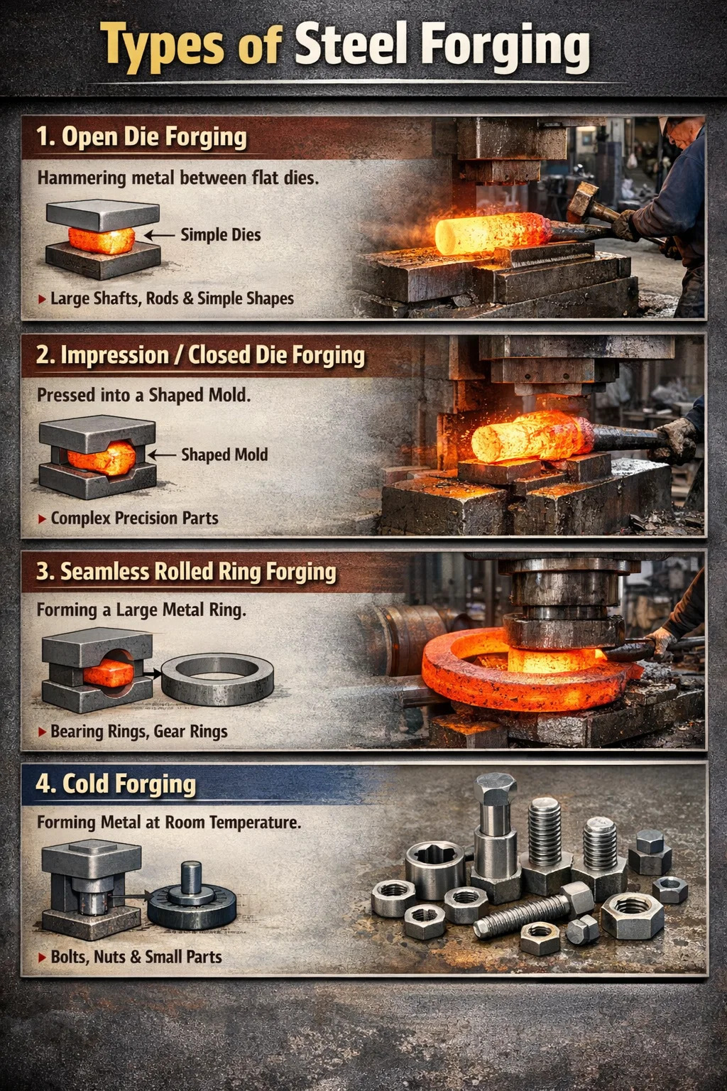 A fémfeldolgozás területén sokféle kovácsolási eljárás létezik. A leggyakoribb osztályozási módszer szerint acél kovácsolás általában a következő négy kategóriába sorolható: