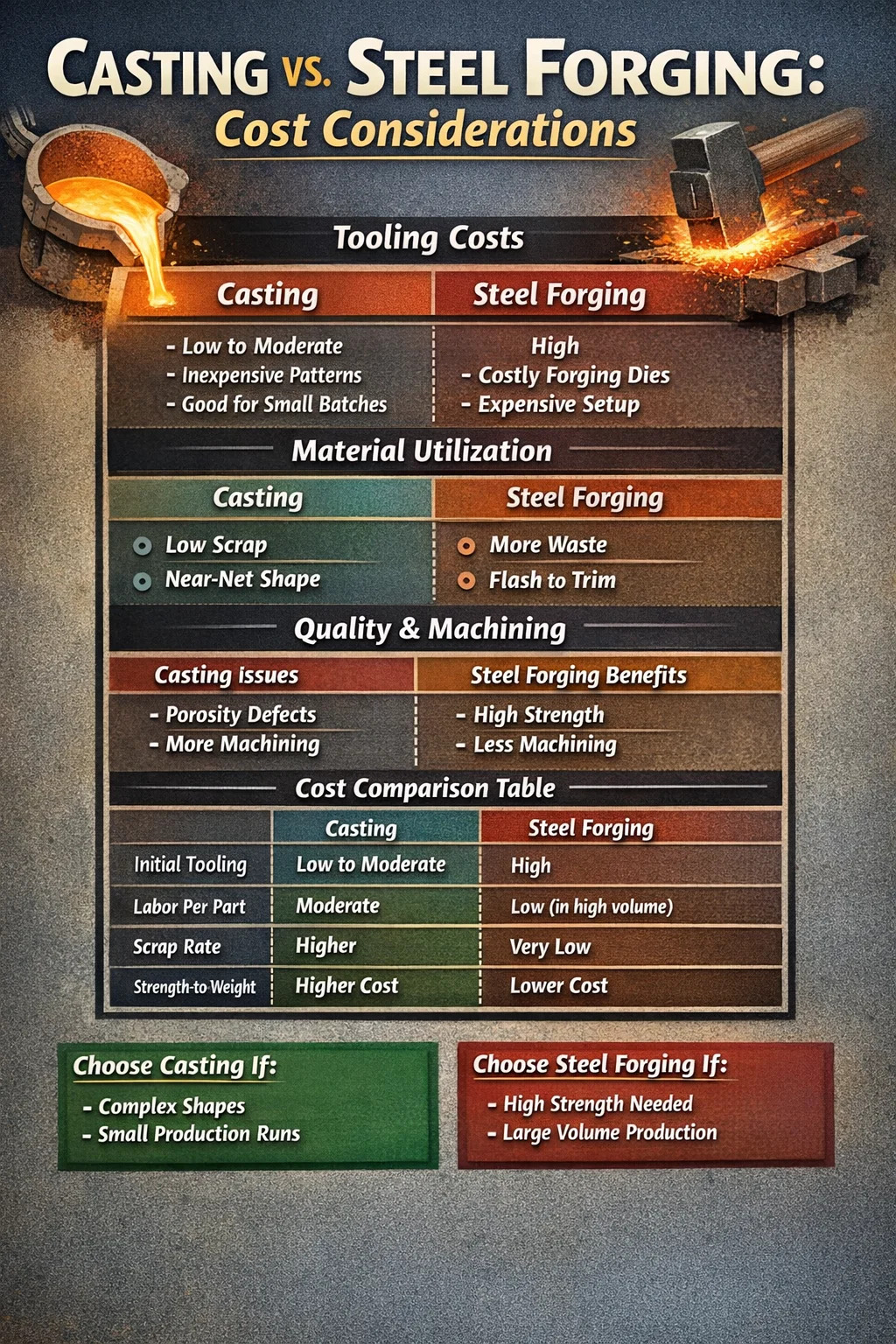 Az új projekt költségvetésének tervezése a szerszámozással kezdődik. Az öntés és a kovácsolás nagymértékben eltérő belépési költségekkel jár, amelyek megszabják, hogy a beszerzési menedzser melyik módszert válassza.